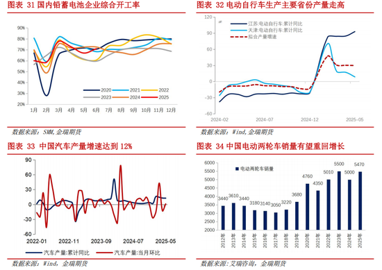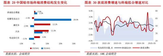 2025年国内消费结构发生巨变,因关税政策导致的不确定增加,中国在上半年结束近三年来铅酸蓄电池出口两位数增速的局面,国内消费增量更多来自政策红利的刺激,这表现以旧换新政策对消费品,如电动自行车和汽车等,产生了明显的促进作用。从表观消费来看,上半年供应端减少(-2万吨),铅锭净进口变动(+1万吨),库存小幅增加(+1万吨),预估表观消费持平去年,维持0.2%的微弱增长。