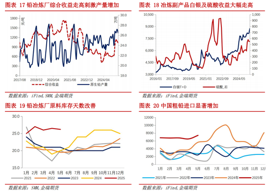 2025年国内原生铅厂在冶炼综合收益走高驱动下产能扩张,预期下半年仍延续增产,在不考虑检修等外部干扰情况下,全年原生铅产量有望增长9.5%(+28万吨)。在2024年,铅冶炼厂因收益接连下降年度减产2.6%(减少8-10万吨),自2024 Q4开始,得益于白银、硫酸、锑铋等副产品收益持续走高,2025年上半年原生铅冶炼厂产量显著增长,其中包括西部矿业去年10月份新扩建投产的20万吨产能逐步达产、新疆龙盛集团5.8万吨电解铅项目在去年12月运营投产。