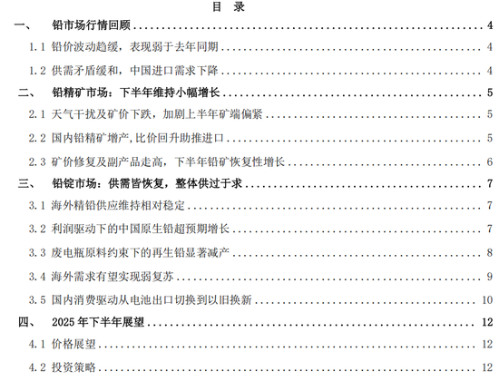 2025年上半年,宏观市场波澜起伏,地缘政治、关税冲突、美联储降息预期等事件交织,金融市场整体呈现较大波动。铅市基本面表现相对平淡,并无显著突出矛盾,年初国内因铅蓄电池春节前补库低预期导致价格下挫,今年春节累库有限,春节后再生复产慢,三月小阳春行情导致阶段性供需错配,一度推高铅价。随后市场交易关税大战,美国对外征收高额关税扰动全球金融市场,铅价急剧下挫。二季度市场维持供需两弱,国内冶炼检修减产叠加需求淡季,季末随着宏观企稳,市场信心有所恢复。