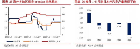 2025年上半年海外地区需求表现偏弱,一方面受到关税谈判的影响,另一方面受到除日本以外的国家汽车产量下降的拖累,海外消费直接挂钩汽车启动电池消费,美国的高利率环境也带来经济负反馈,从现货表现来看,海外各地区现货premium也无显著变化。