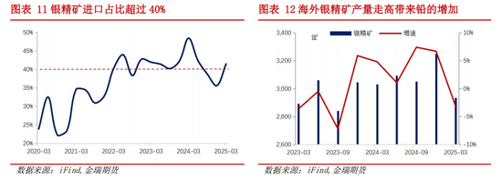 值得注意的是,海外铅精矿增量需同步考虑银精矿增产带来的铅的增量,这是我们预期之外无法统计的量级。随着金银价格持续创下历史新高,进一步刺激了银精矿的产量,2024年海外银精矿产量增速为5%,铅精矿增速为4%。银精矿中含铅量30%-40%不等,我国通过银精矿报关进口的铅精矿比例已超过40%,银精矿也是铅冶炼厂原料的重要来源。今年1-5月份,我国银精矿进口同比增加5%,进口国也从去年同期的18个国家增至今年38个国家。