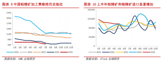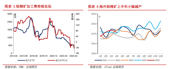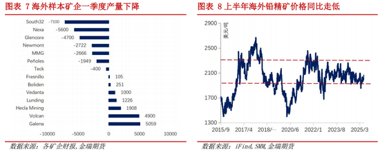 2025年上半年海外铅精矿整体减量,天气干扰及矿价下跌加剧矿端偏紧。铅精矿进口矿加工费从年初-20美元降至年中-50美元,市场最低报价为-100美元,负加工费持续且无改善迹象,根据统计的14家样本企业财报数据显示,一季度铅精矿产量下降3.7%(折合1万金属吨),海外矿山减产有天气不可抗因素,例如森林大火、洪水等天气影响,也有部分受采矿条件、环保及检修因素的约束,预期要二季度才会恢复。与此同时,部分矿山因新增产能投放导致的增产,例如澳大利亚Abra、Zhairem、塔中矿业等。